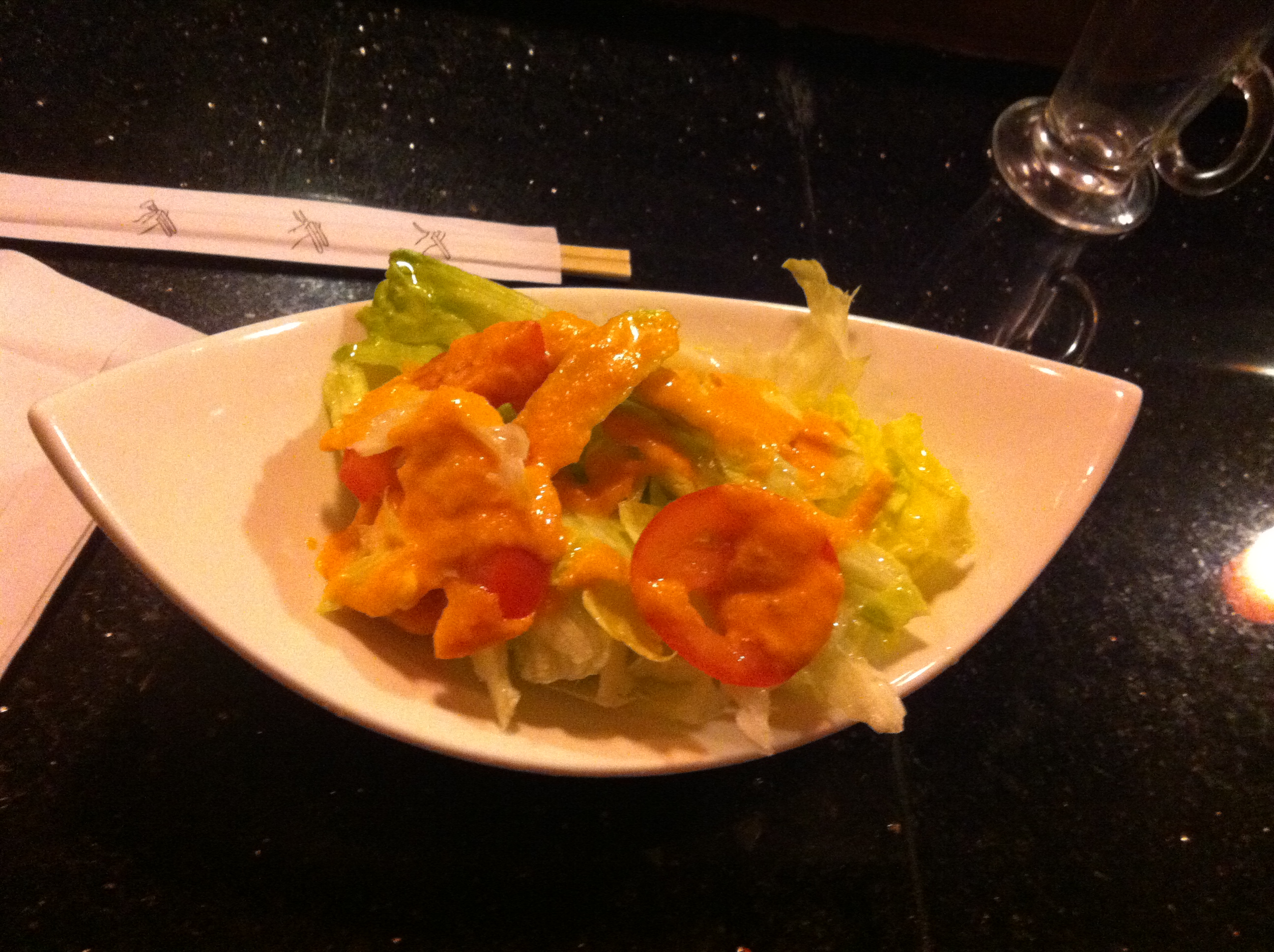 The three of us entered the restaurant and were greeted by the delightful proprietor I described above, and decided to sit at the bar so we could watch the chef’s create the magnificent dishes we were about to order. As I stated in my last blog, Kat does not eat seafood, so she ordered the Veggie Roll Combo for $8.95, which consists of a Cucumber Roll, an Oshinko Yamagobo Roll, and an Avocado roll. Evan and I decided to share the Deluxe Sushi for Two entrée, which consisted of a Rainbow Roll and a Spicy Tuna Roll plus a variety of 16 other pieces of delectable Sushi for only $28.95. Each of our meals included a rather large salad, with a fantastic homemade ginger dressing, and Kat ordered some edamame for the table as well. If the prices were not spectacular to begin with, Six Happiness is also a bring your own bottle establishment, which in turn will save you even more money.