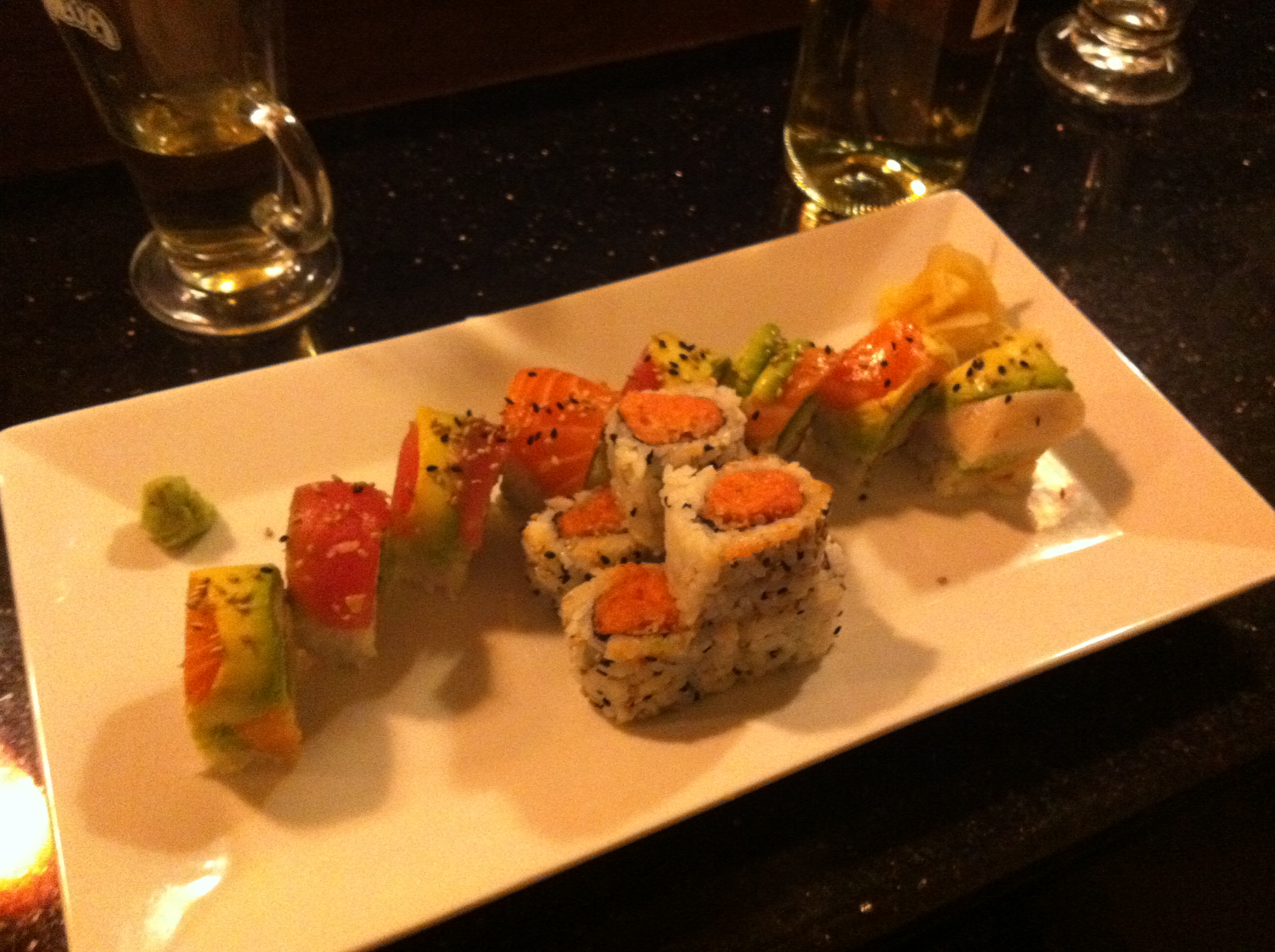 Our sushi arrived within minutes of us completing the salads and edamame. Kat enjoyed her veggie rolls as she always does. She loves the simplistic nature of the rolls they serve at Six Happiness, as opposed to some of the other local sushi places we have been to, that try to mix too many items into a veggie roll which tends to ruin them.
