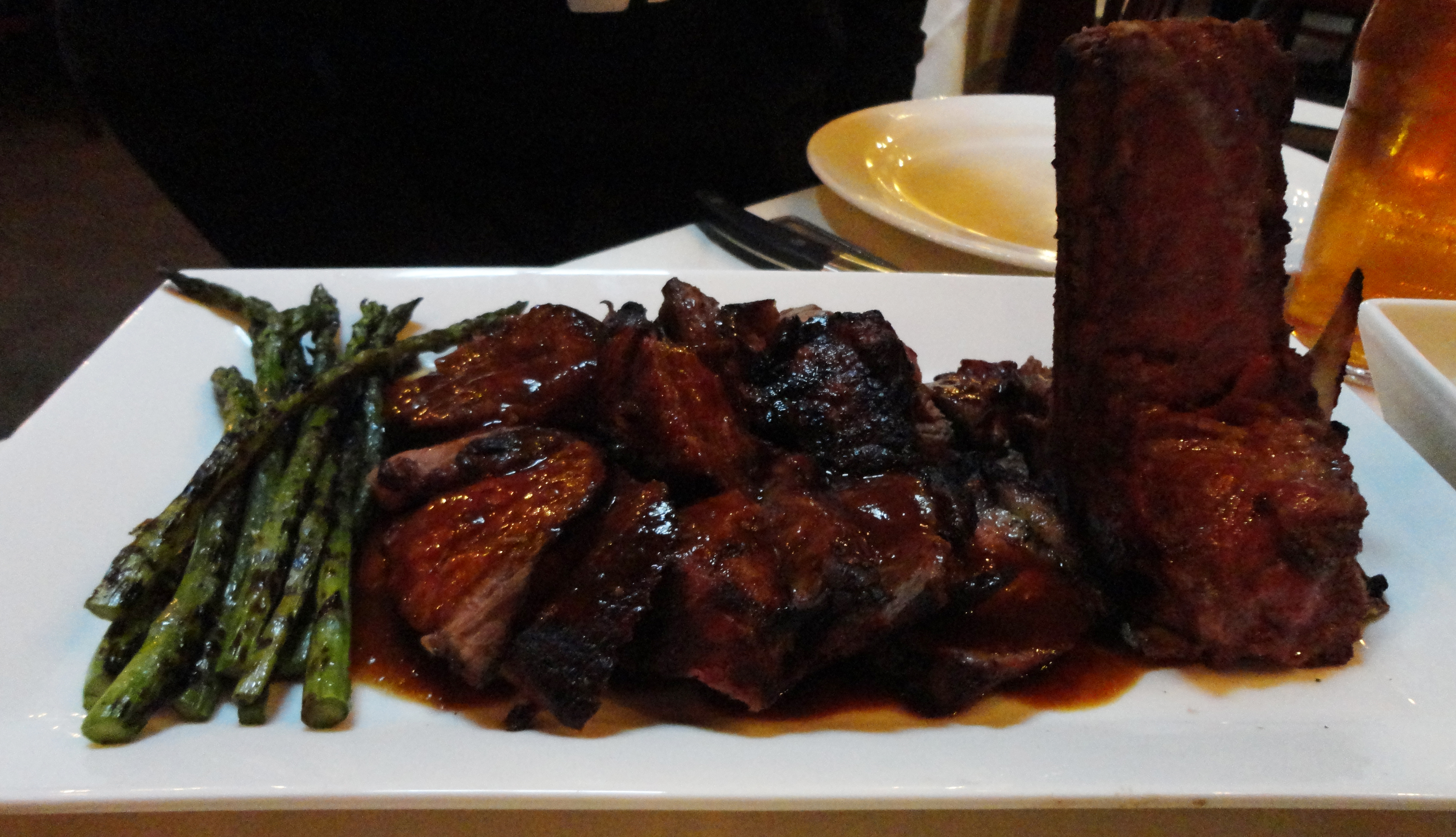 With our drink orders in, it was time we got down to the nitty-gritty, the most daunting task of any meal, ordering the main course. I attempted to sway my partners in crime to assist me in devouring the TC Family Bedrock Steak, which weighs in at a formidable 64 Oz of meaty goodness, only because it would have been the largest steak I have ever ordered in my foodie career. Alas, I was only able to convince one of my fellow patrons to join me on a gluttonous meaty adventure and therefore, we decided upon the aforementioned Dry Aged Porterhouse for two, which was accompanied with two sides of our choice, the grilled asparagus and Spinach Mushroom Quinoa, and rang up at $79.00. Our better halves, that apparently did not want to eat damn near half a cow, opted for dishes that were slightly less excessive but sounded equally as appetizing, electing to order the Free Range Chicken described as an Amish free range half chicken paired with potatoes and asparagus for $19.00 and the TC Chicken Pot Pie described as free range chicken, carrots, Yukon gold potato, peas, corn, pearl onions, with puff pastry for a modest $14.00.
