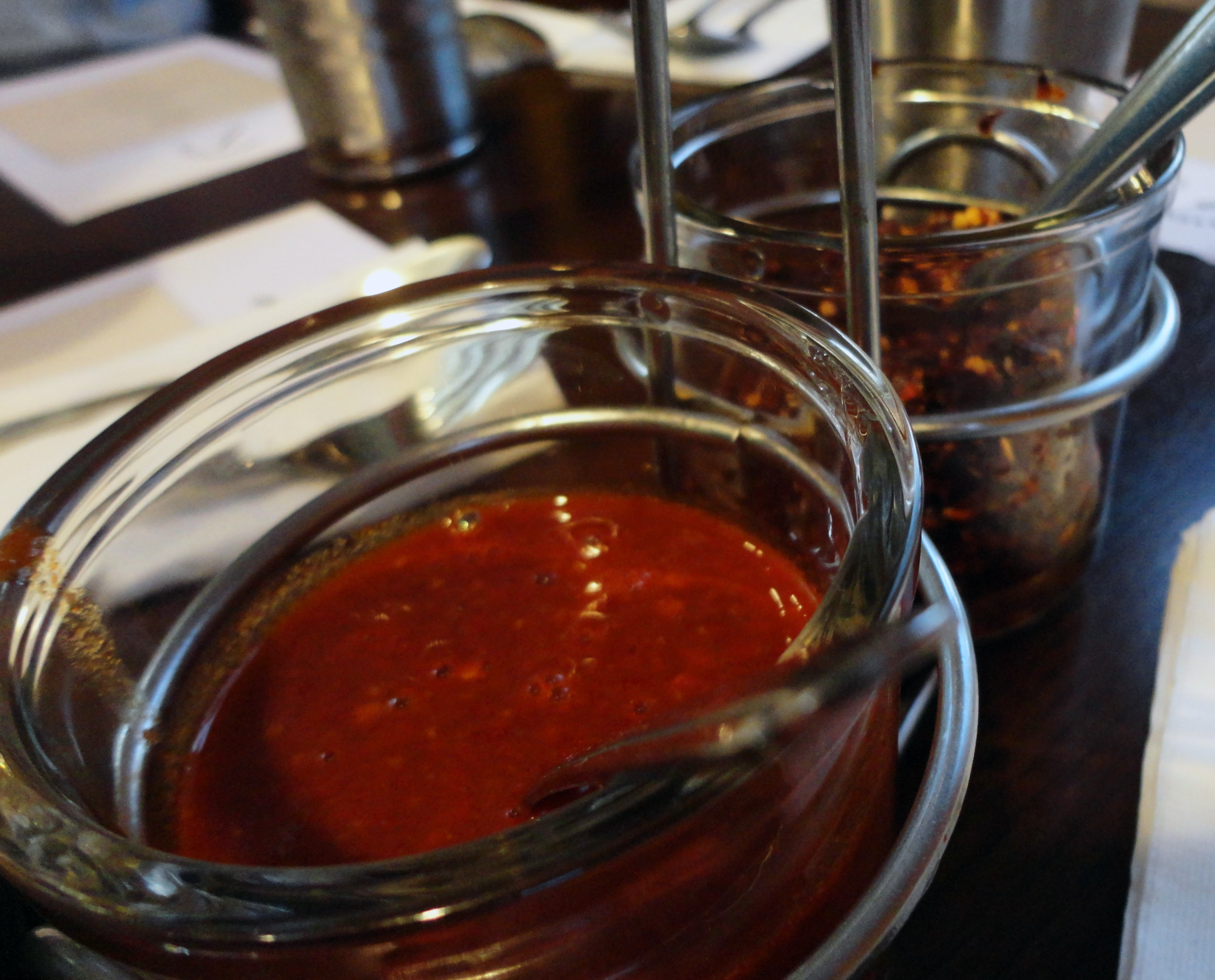 The first thing to hit our table was a caddy that held two vessels which contained two different, slightly scary, spice concoctions that caused some minor whispering throughout our table. All of us were curious, but we were also a little apprehensive since the predominant color of these potions were bright red, and we were under the assumptions that they were going to either kill us or destroy our taste buds for the upcoming meal. Eventually, one of us dipped our fork into the evil looking spices and tasted what turned out to be an extremely pleasant sauce with a subtle yet lingering heat that was not offensive at all.