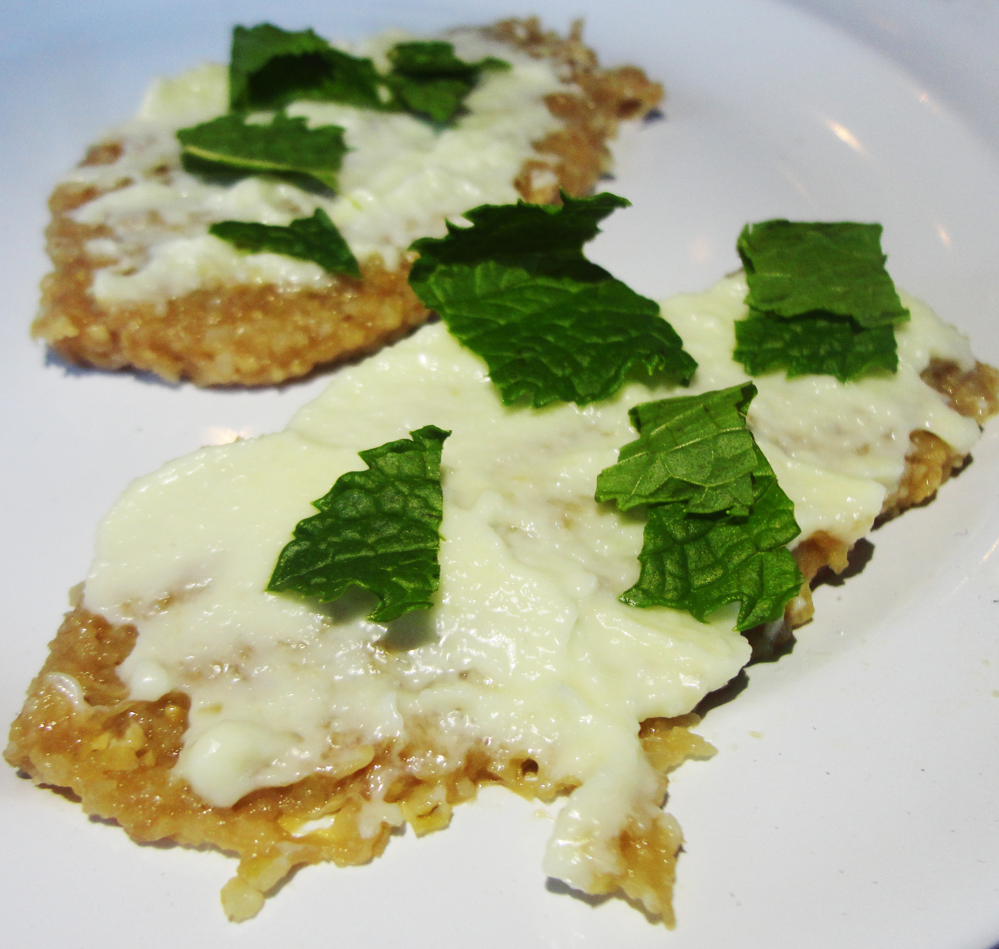 Prepared similarly to sweetened cottage cheese, and topped with fruit and crushed pistachio.