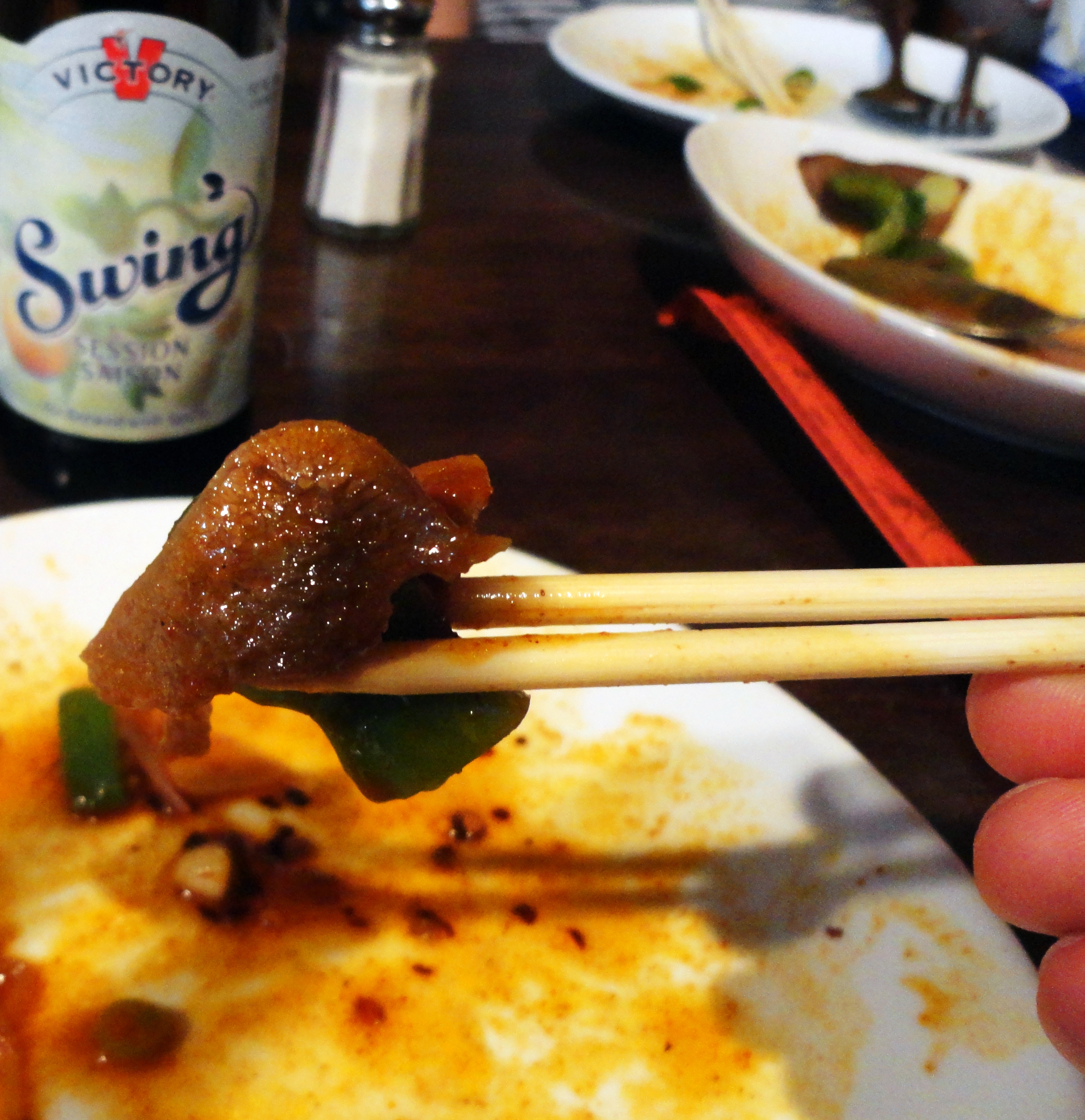 Following the blood sausage was not going to be easy for any dish, but none the less the Dropa Khatsa or Tibetan style beef tripe entered the eating arena. Since the supposed death sauce was less killy than I thought it would be, I disregarded the bright red flakes and rosy glistening hue that appeared on the plate in front of us. That my friends, I can tell you, was not the best idea. Don’t get it twisted, this dish tasted amazing, but I should have taken a much smaller first bite. The heat slowly built in my mouth and set up camp on my tongue. Being a seasoned, see what I did there, professional with spicy foods; I did not go for my water or my beer and just waited the heat out as it slowly dissipated. I then of course ate more of the tripe because I can’t resist a nice kick in the taste buds.