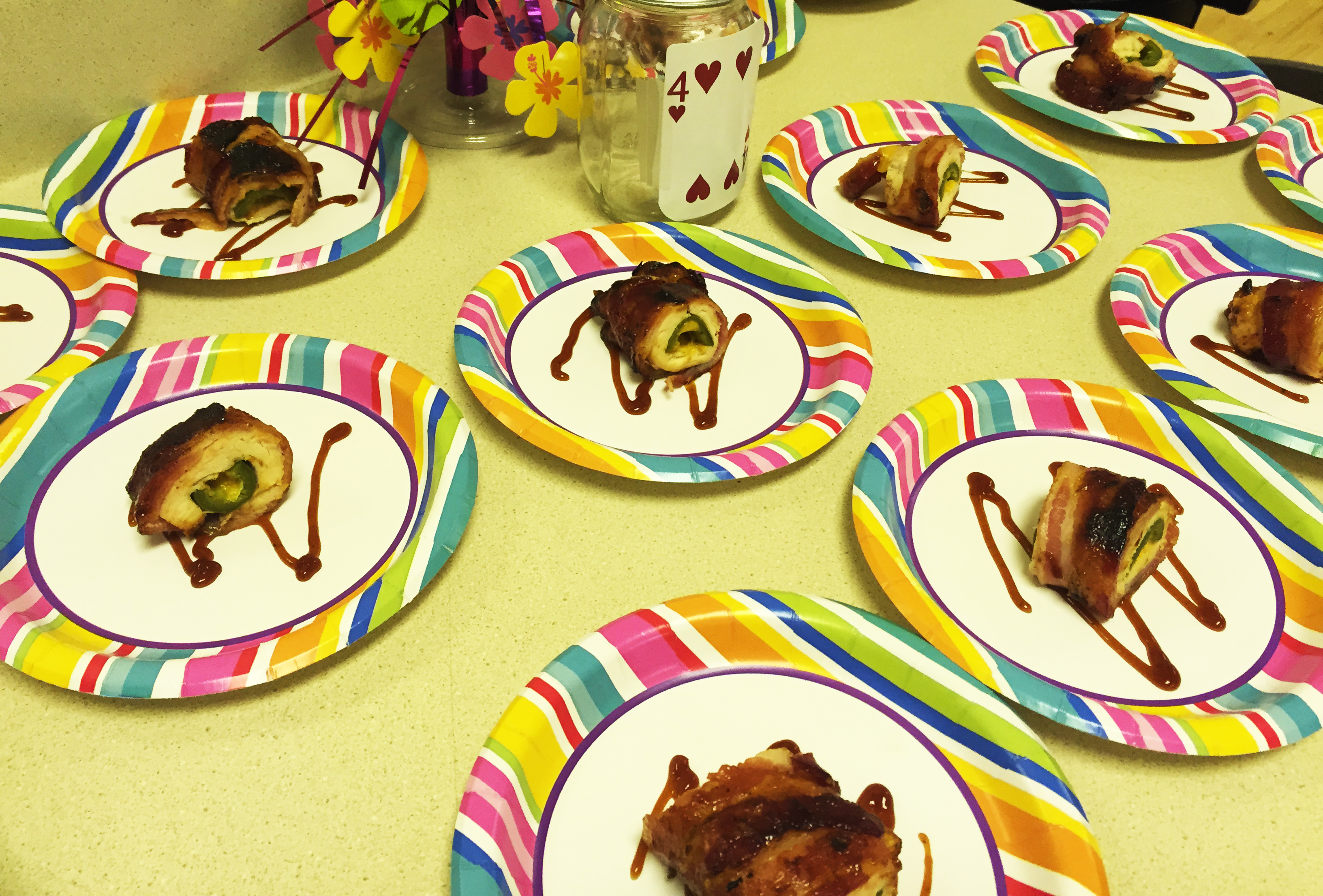 Jalapenos filled with cheese, stuffed in chicken, and wrapped lovingly in bacon.