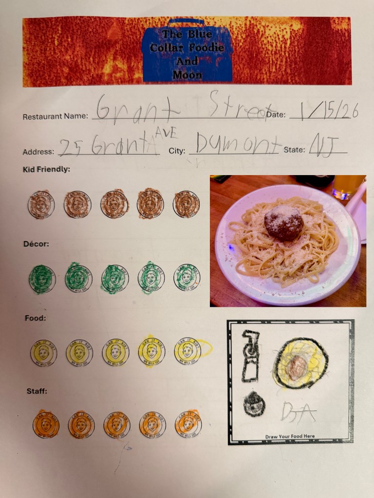 For our first joint epicurean adventure, Daniel chose to visit our favorite family-friendly restaurant, Grant Street Cafe, located at 25 Grant Ave. in Dumont, NJ 07628.  Full disclosure, we joke all the time that Grant Street Cafe is Daniel’s favorite bar, and to be honest, it is mine too!  So, spoiler alert, this place is going to get a rave review from both of us!
