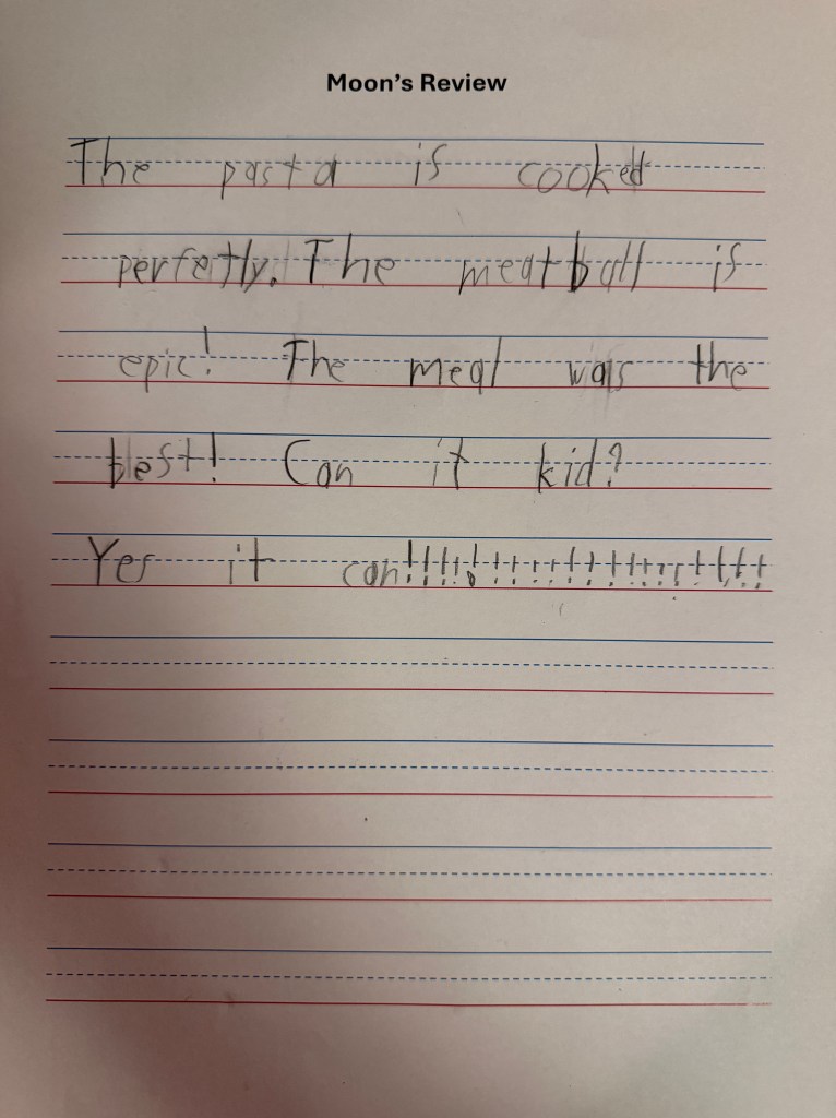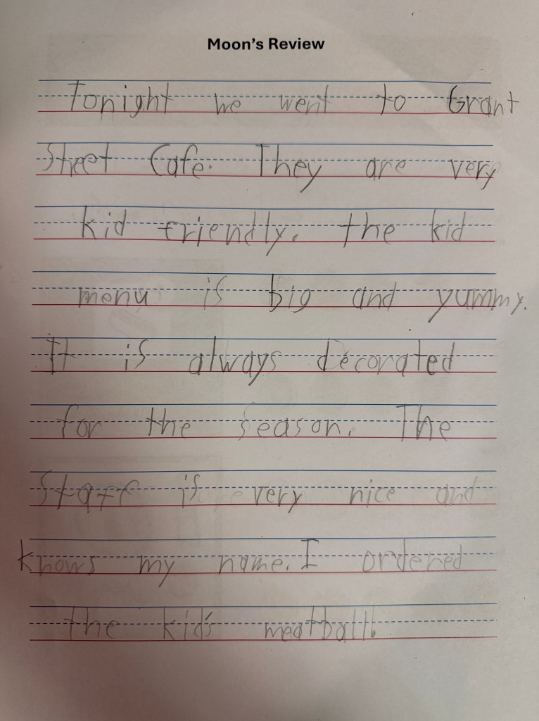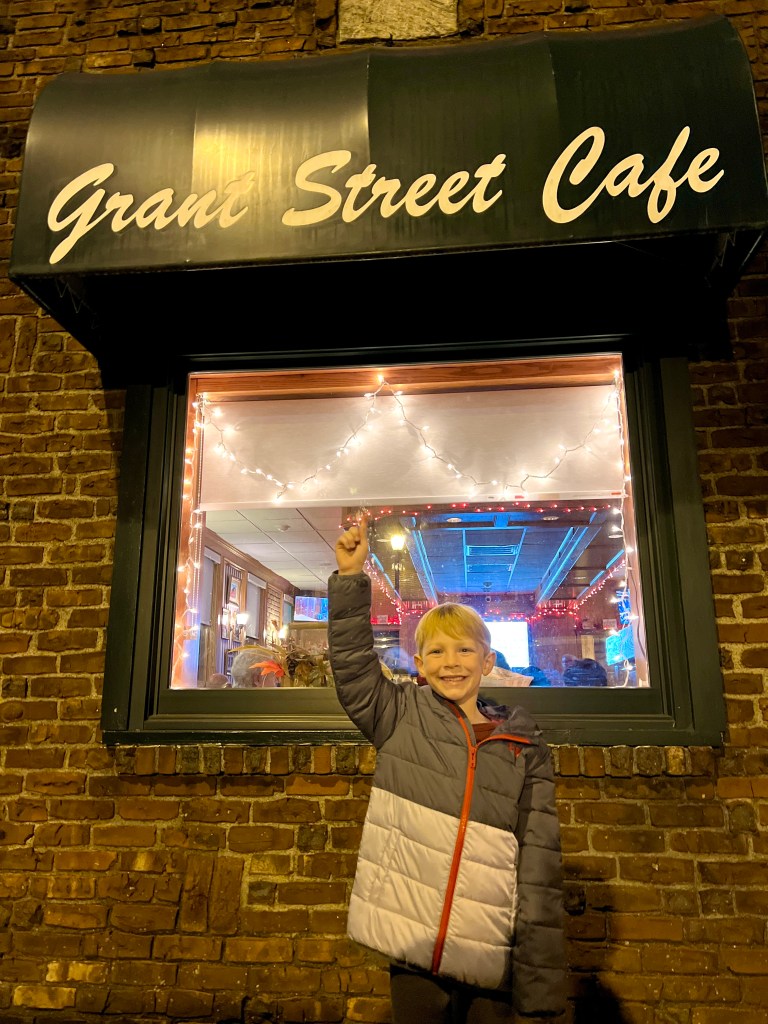 “Tonight we went to Grant Street Cafe. They are very kid-friendly. The kid menu is big and yummy. It is always decorated for the season. The staff is very nice and knows my name. I ordered the kid’s meatball. The pasta is cooked perfectly. The meatball is epic! The meal was the best! Can it kid? Yes it can!!!!!!!!!!!!!!!!!!!!”