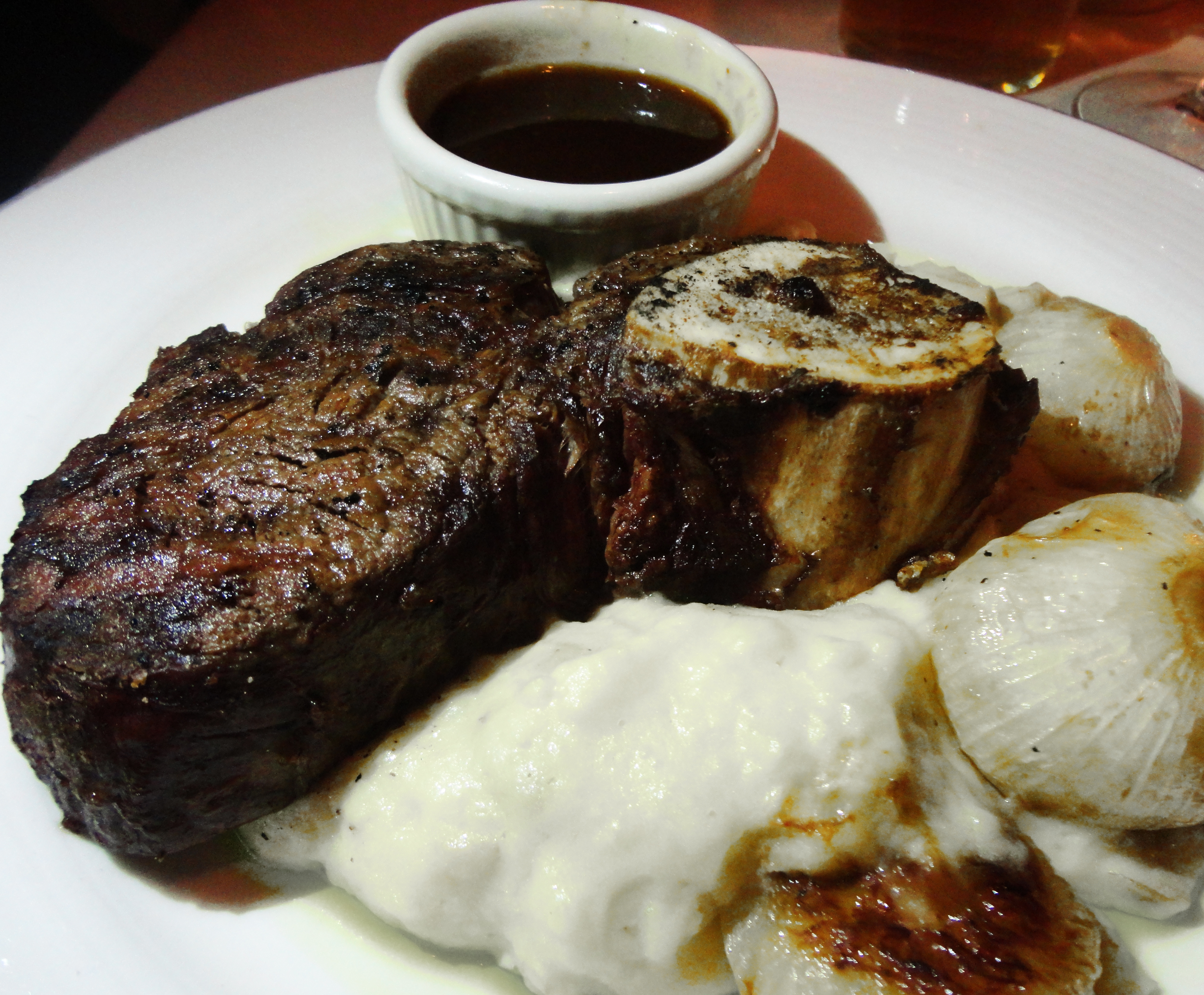 We decided to dig into the Braised Short Ribs first. The meat was fork fight tender, which is what I look for in a good Short Rib and cooked expertly. Even though, the meat was phenomenal, once again the sauce stole the show. Not to mention the fact that when I dipped the Garlic Mashed Potatoes in the gravy, I took a one way trip to flavor town!
